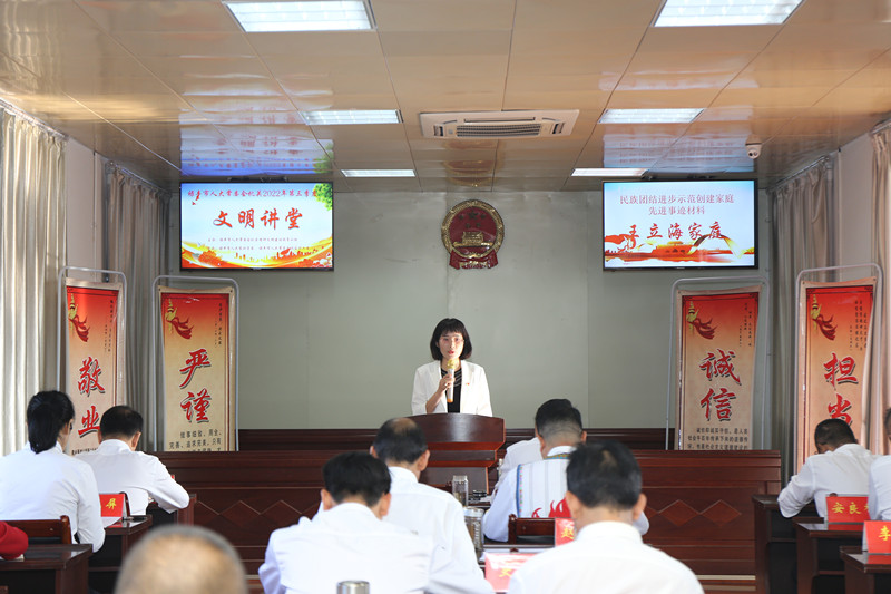 9月26日,在禄丰市人大常委会第三季度文明讲堂“学先进”环节,杨丽美正在娓娓向大家讲述着身边的典型故事——在2021年“民族团结进步示范家庭”创建活动中被授予州级“民族团结进步示范家庭”的王立海家庭先进事迹。