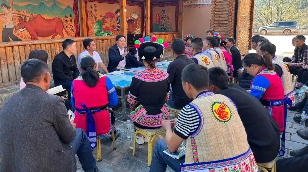 在河南村委会,村“两委”班子、驻村工作队员、县乡各相关部门人员与河南村的彝族同胞围坐一堂,聆听任敏结合河南村实际,全面准确解读阐释党的二十大报告精神实质。