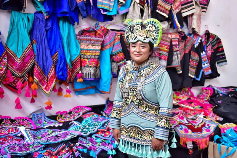 近年来,永仁县紧紧抓住历届赛装文化节这一重要契机,将发展彝族刺绣产业同弘扬彝族文化紧密结合起来,通过打响永仁彝族赛装节、彝族刺绣品牌,引导了永仁人民走向致富之路。随着不断挖掘弘扬传承赛装文化,彝绣产业也得到了积极的发展,也为山乡带来了巨变。 从农家妇女到创业带头人 41岁的起琼翠就是变化中的一抹亮色。她是永仁县当地的彝绣艺人,自幼跟随母亲、奶奶及村寨里的彝族刺绣艺人精心学习,在多年的学习和实践中练就了独特的彝族刺绣和彝族服装设计制作技能技巧。她把样品设计、刺绣的技能技巧传授给当地的绣娘们,然后把直苴的刺绣作品收集到一起后进行改良加工,借助中和、莲池、猛虎等乡镇刺绣合作社的合作,将绣娘们制作的具有民族特色的衣服远销在外。