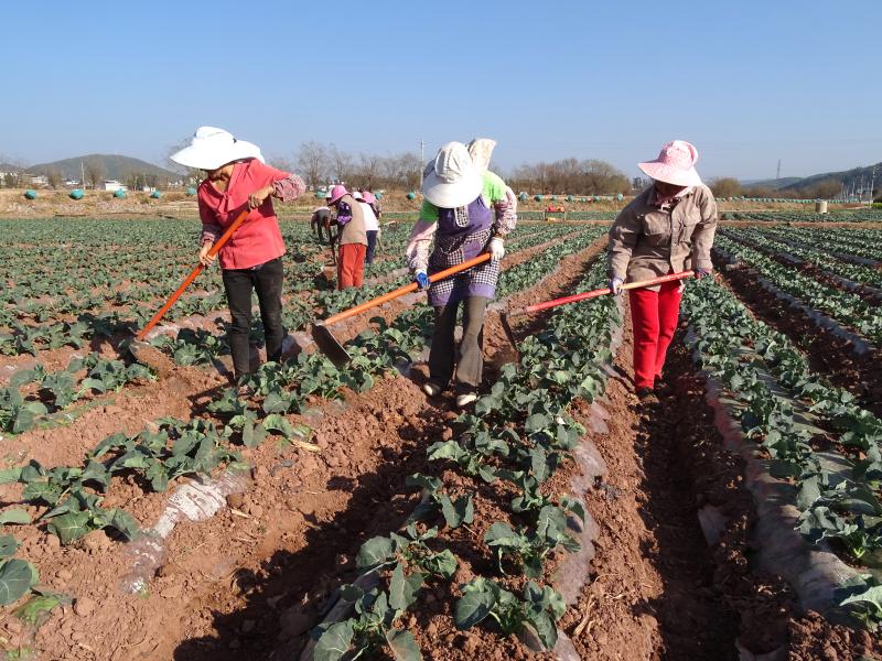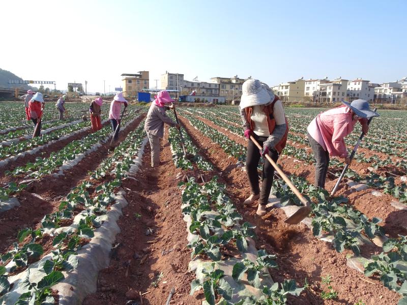 新时代民族网讯(者美春)人勤春来早,田间农事忙。近日,在南华县龙川镇火星社区下山脚村西兰花基地里,刚刚栽种完近1个月西兰花株肥叶绿、长势喜人,基地老板雇请当地农民为西兰花垄沟盖土、除草、除虫等管理,促进植株生长发育。