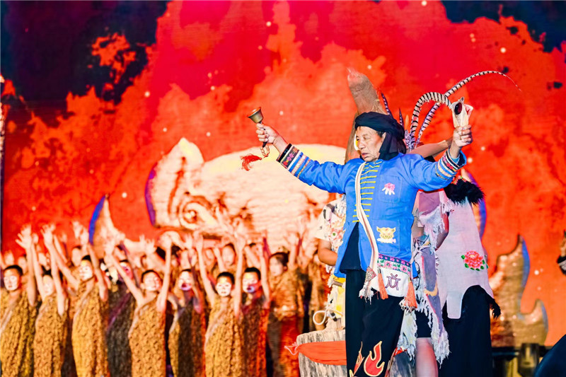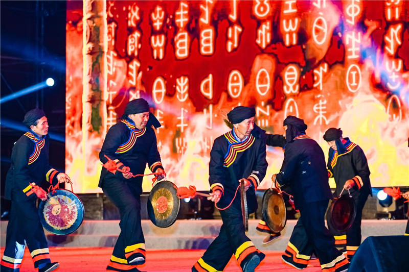 在彝话吟唱的古歌声中,非遗传承人们鸣锣起舞,背景的大屏上彝族史诗《查姆》在火焰中熠熠生辉,这是彝族在岁月长河中流淌千年的印记。