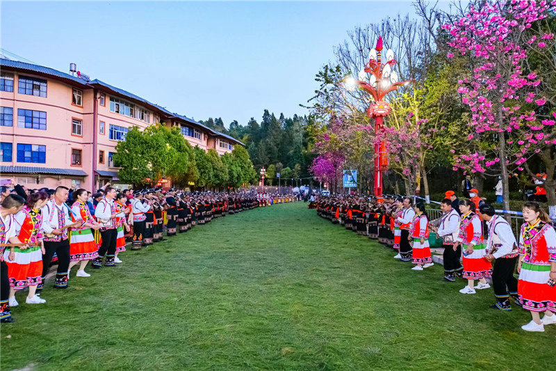 松针铺满查姆文化广场,铺满长长的迎宾大道,彝家人敲着鼓、跳着舞、吹着号,欢迎着远亲近邻和各方朋友。路远心不远的远亲是缔结友好城市的江苏省宿迁市沭阳县的亲人;是对口帮扶,山海情深的上海亲人、教育扶贫润虎乡的海安亲人、千里结缘的北京亲人;是来自各地,扎根双柏投资兴业的亲人……