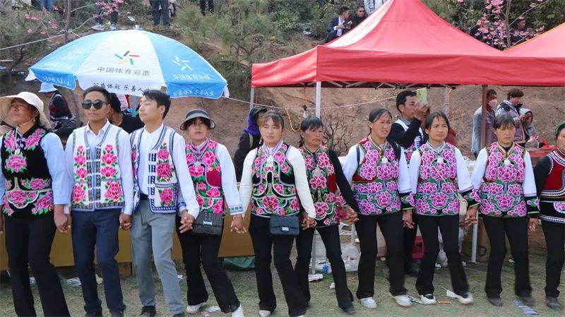 彝族歌舞会现场,大家穿着彝族服装围起圈,手拉手跳舞,节奏激昂明快,用独特的仪式感来庆祝马缨花节的盛况,为五街疯狂上分“圈粉”。