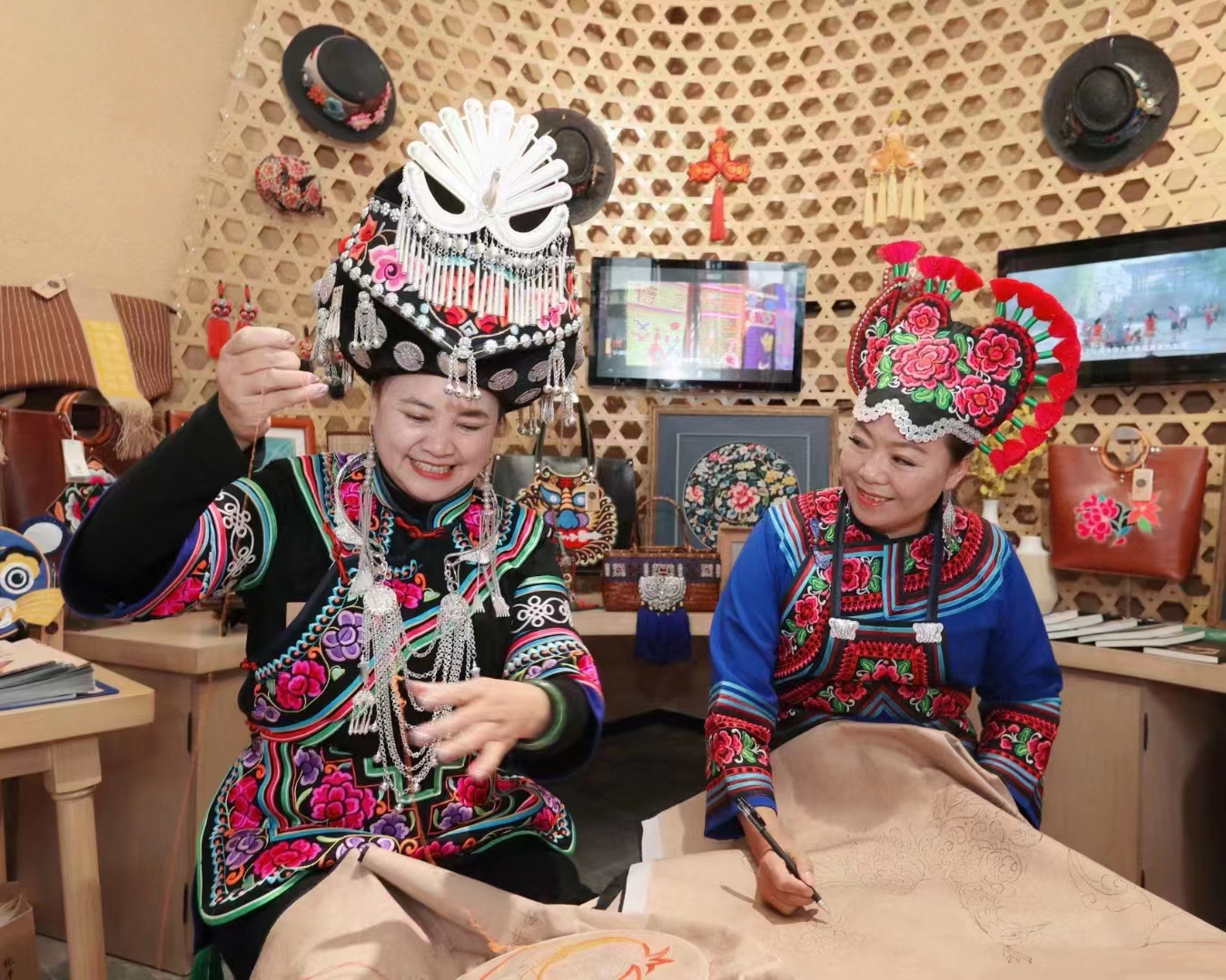 彝绣在中华美术体验馆(主题:匠心传承)展陈,形象展示楚雄灿若星辰的传统技艺及工艺品,展区除了成品实物、视频介绍、3D成像等展示外,组织了李长征等多位国家级非物质文化遗产代表性传承人到现场演示、传授制作技艺。