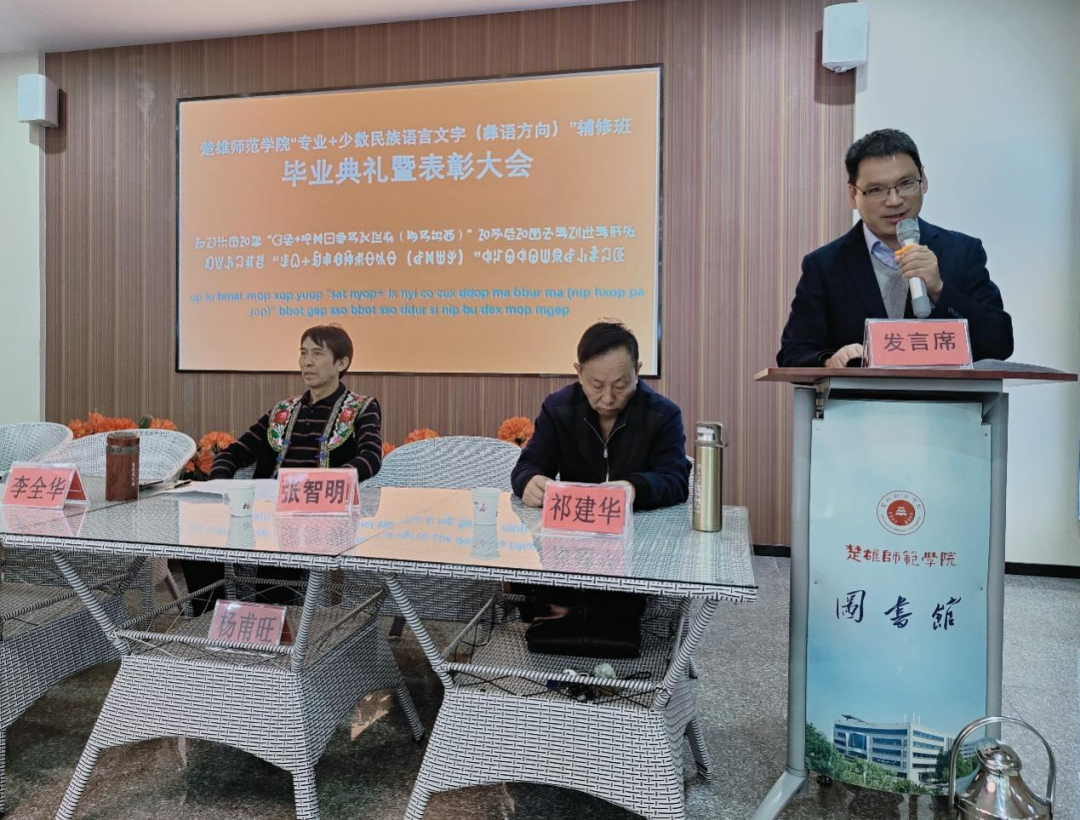 新时代民族网讯(张智明 民族时报记者陈明海)3月25日,楚雄州人民政府与楚雄师范学院校地合作项目 “专业+少数民族语言文字(彝语方向)”辅修班毕业典礼暨表彰大会在楚雄师范学院彝族文化学院图书馆博传中心举行。中共楚雄州委统战部副部长、州民族宗教委主任鲁文兴、楚雄师范学院副校长何永泰及有关部门负责人和彝族文化学院全体师生出席了会议。