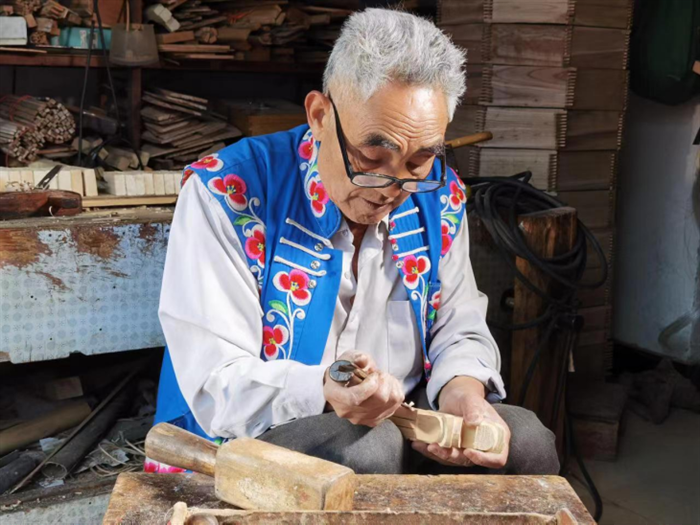 王光金从10多岁就开始跟随父亲学习制作龙头四弦琴,因为热爱和坚守这门传统手工技艺,他一做就是50多年,他的儿子王文剑是第四代传承人。在多年的实践中,从选材到制作完成的每道工序,王光金都熟练掌握,并对每道工序“吹毛求疵”。“制作四弦琴不仅要有一定的木匠和美术功底,还要懂手工雕刻,最重要的要熟悉彝族调子的旋律。”王光金说,只有懂旋律才能在安装调试中保证龙头四弦琴发出的音色符合左脚调的发音要求。