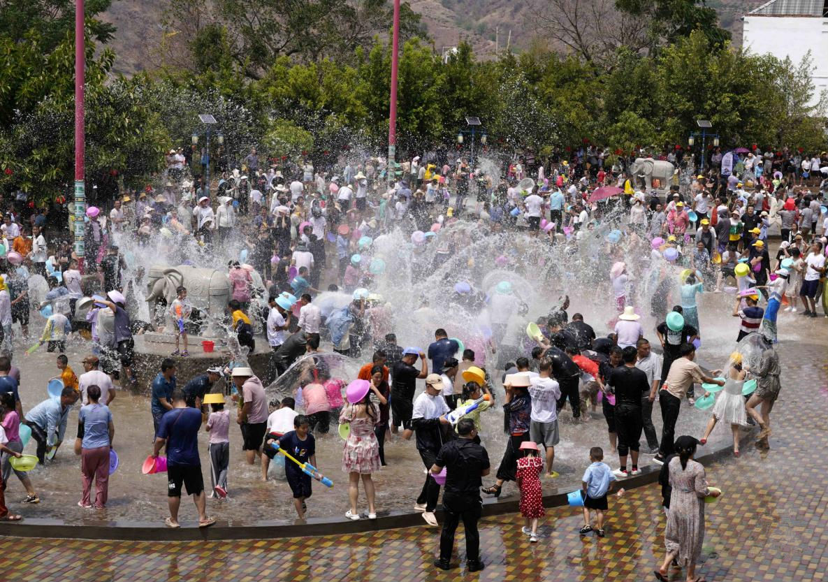 “水!水!水!”不论民族,不分男女老少,所有人尽情地欢呼着、泼洒着幸福、吉祥之水,漫天的水花肆意飞溅,表达着相互间的无限祝福。歌舞表演目不暇接,敲响象脚鼓,跳起嘎秧舞,浓郁的民族风情独具魅力……泼水节期间,广场周边早早搭起摊子,“赶摆”活动从每天早上持续到晚上,傣族服饰、特色首饰、羊汤锅、玉米粑粑、各式果饮、凉拌野果、烧烤、冰淇淋车、泼水工具、鲜花花束等依次摆开,种类繁多,令人眼花缭乱,游客们随心所欲地吃个痛快、玩个开心,载歌载舞,好不热闹。