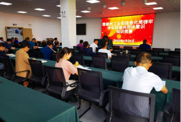 2023年4月25日下午,州工业和信息化局机关全体干部职工在认真学习党的二十大报告、中央民族工作会议、《宪法》《民族区域自治法》《中国共产党统一战线工作条例》《云南省民族团结进步示范区建设条例》《做好新时代党的民族工作的科学指引—学习贯彻习近平总书记在中央民族工作会议上的重要讲话精神》等有关民族团结内容的基础上,举行了铸牢中华民族共同体意识知识竞赛。通过现场培训、现场做题、现场批阅和现场答疑等方式,让民族团结进步教育入心入脑,进一步激励机关党员干部牢固树立休戚与共、荣辱与共、生死与共、命运与共的共同体理念。(楚雄州工业和信息化局) |