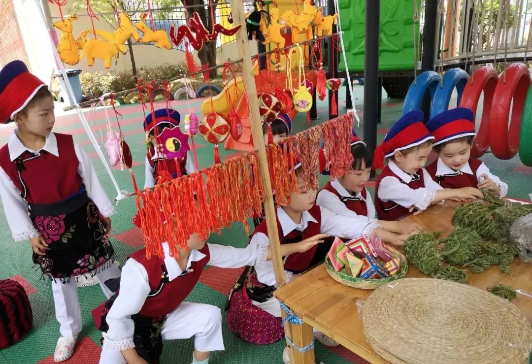 草海镇第二幼儿园教师寸汝云说:“鹤庆人民的乡愁非常浓郁,每一个节日都很隆重。在幼儿园,利用这些节日开展民族文化展演活动,效果非常好。端午节前,水田里的秧草长得正绿,孩子们对用秧草编织的手工艺品非常感兴趣。我们正是抓住这一契机,和孩子们感受端午节的氛围。”随后,寸汝云带着孩子们一边读着鹤庆方言童谣,一边编着秧草饰品,乡音环绕,更添一分浓浓的乡愁。