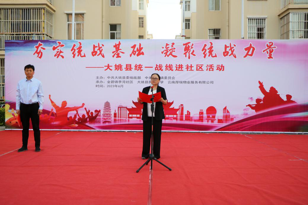 新时代民族网讯(民族时报记者 陈明海)6月1日,由中共大姚县委统战部、中共金碧镇委员会主办,金碧镇李湾社区、大姚县民族中学、云南厚瑞物业服务有限公司共同承办的“夯实统战基础 凝聚统战力量——大姚县统一战线进社区”活动在李湾社区举行。
