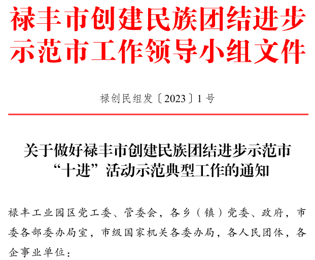 新时代民族网讯(民族时报记者 陈明海)禄丰市坚持党建引领民族团结进步示范创建,深入贯彻党的民族政策,完善党委领导民族工作体制机制,形成党委统一领导、政府依法管理、统战部门牵头协调、民族工作部门履职尽责、各级各部门通力合作、全社会共同参与的生动实践,全面构建新时代党的民族工作新格局。