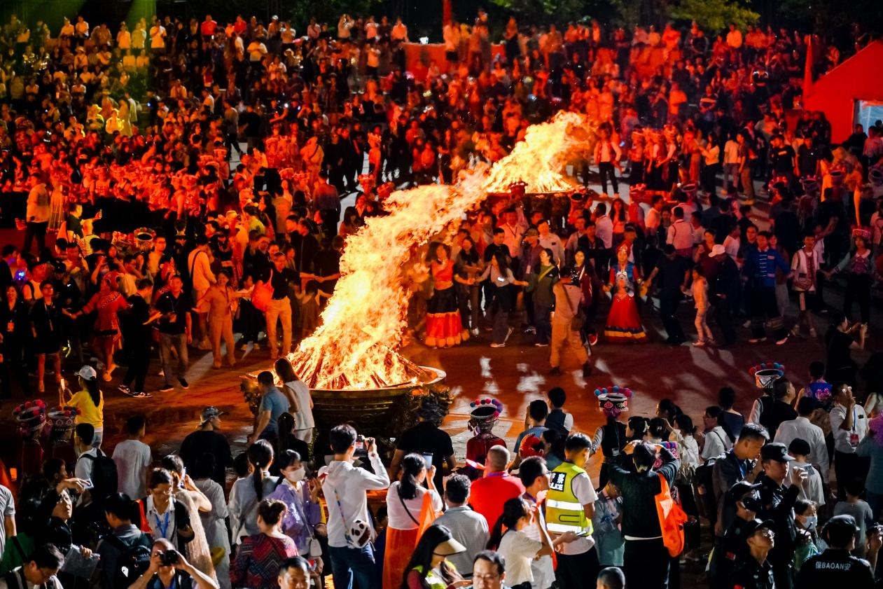今年的楚雄彝族火把节,以“人类故乡?中国火城”为主题,开展了万人左脚舞、花车巡游、彝绣动态展、水舞幻影秀、彝族太阳女选拔赛等系列活动,吸引大量游客前来,共享了一场节味浓、“火”韵旺、人气足的狂欢盛宴。