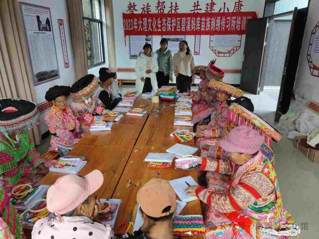 据悉,在2023年12月,大理文化生态保护区南涧玛库苗绣传习所开展了一期传习培训活动,在碧溪乡镇文化站的带领下,参与培训学员充分发挥自己的想象,设计苗族刺绣图案和花样,他们把苗族刺绣这项传统技艺做成了一件件手工工艺品。