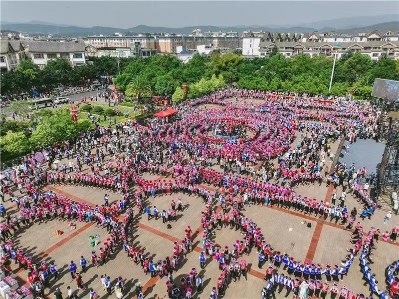 随着中共楚雄州委副书记、州人民政府州长张文旺宣布仪式启动,彩烟升腾,渲染了碧蓝的化湖。广场上、化湖边,县城里,上万名身着彝族盛装的群众围成无数同心圆,唱着左脚调跳起左脚舞。广场上开满了“马缨花”,那是盛装的彝家女子头上的双花球,随着咚咚的左脚舞步,热烈地摇摆在立夏的风中。大家把千层底跳穿,把绣花鞋跳烂,享受着这独属于牟定的狂欢和浪漫。