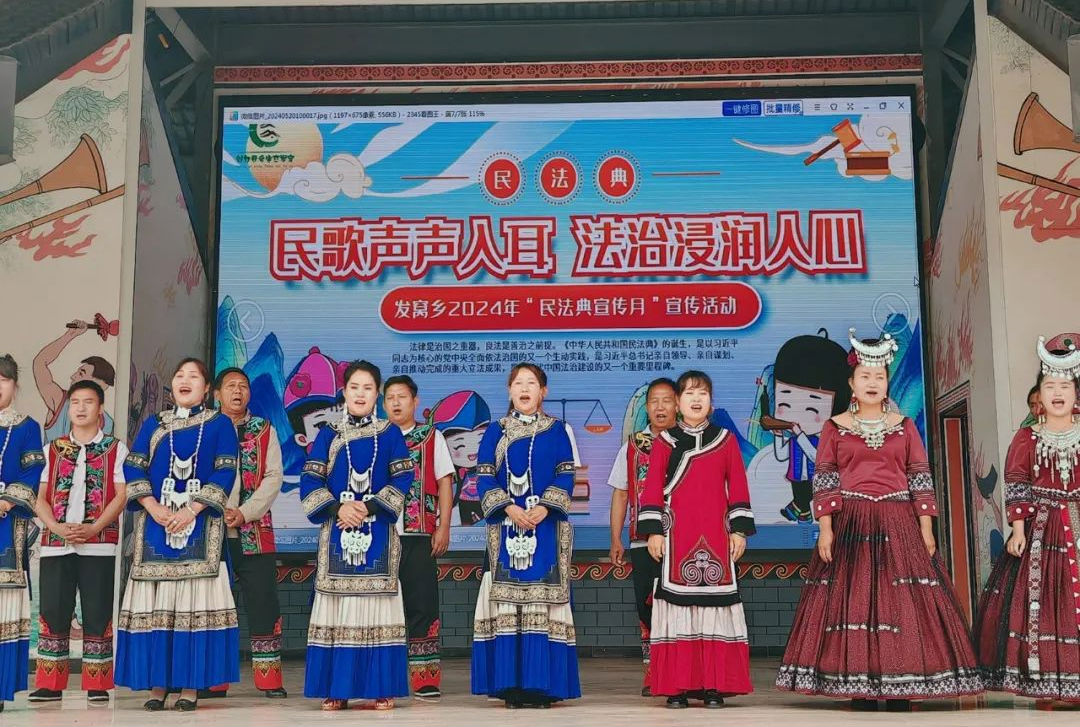 近日,武定县发窝乡“民歌声声入耳 法治浸润人心”“民法典”宣传活动在发窝民族文化广场举行,依托乡土特色的民俗民情活动,走出民族特色元素与普法宣传深度融合的法治宣传新路子,让铸牢中华民族共同体意识植根于各族干部群众心间。