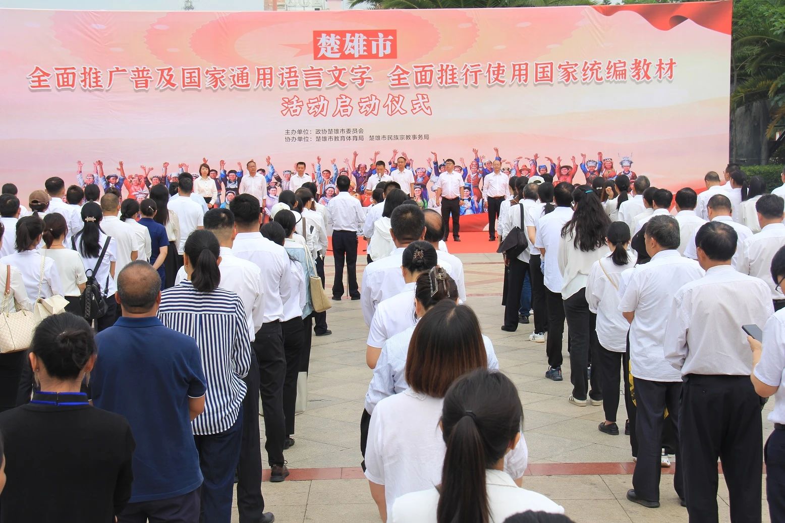 近日,楚雄市聚焦铸牢中华民族共同体意识,围绕全面推广普及国家通用语言文字、全面推行使用国家统编教材,在楚雄市桃源湖市民广场举行“双推”活动启动仪式。全市各级各部门干部群众代表300余人参加启动仪式。