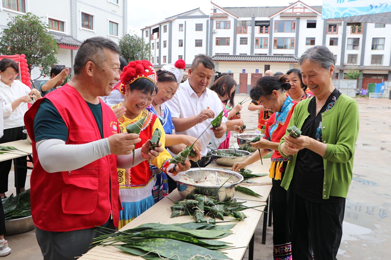 包粽子,话端午,围坐一堂增情谊。在庄严的升旗仪式结束后,彝人古镇社区门口和食堂内,社区工作人员与党小组长、人大代表、民族团结进步示范户、依法文明诚信经营示范户、拥军示范户、辖区居民等围在一起,包着传统的粽子,聊着平凡的日子,欢声笑语此起彼伏,节日的喜悦和邻里的情谊在此交织绵延。