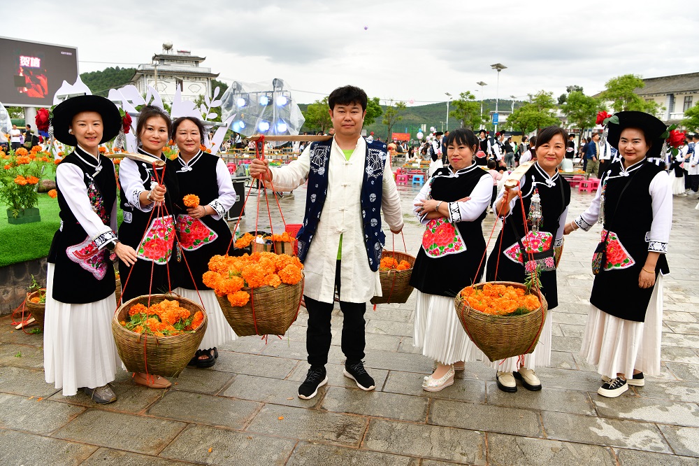 金花宴上,杨方村广场60桌用青松毛、万寿菊包围的金花宴,桌连桌、凳连凳,欢声笑语此起彼伏,当地干部群众和不同民族、不同村组的人们围坐一堂,共同分享这份来自白乡同胞的热情、对未来生活的美好憧憬、对丰收的殷切期待,体验着白族文化的独特魅力和浓浓的民族风情。