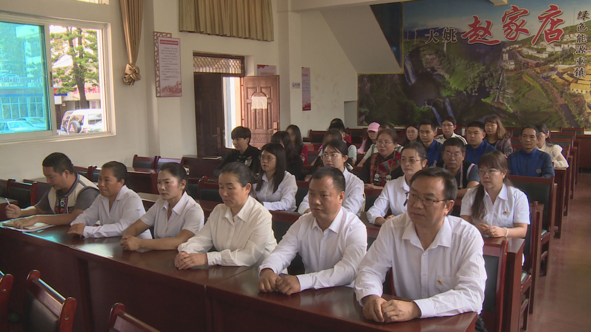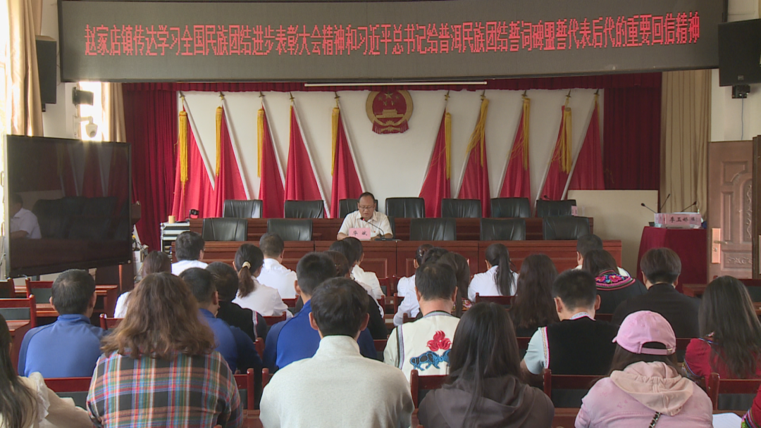 赵家店社区紫丘村是金沙江沿岸“直过民族”易地搬迁的一个集中安置点。2013年,铁锁乡七棵树村的5个小组90户316名彝族、傈僳族群众搬迁到赵家店镇赵家店社区紫丘村,结束了世居深山,不通水电路的生活。2023年,赵家店镇被命名为省级民族团结进步示范乡镇。 在赵家店镇党校会议室,干部职工们正全神贯注地进行专题学习,认真研读习近平总书记在全国民族团结进步表彰大会上的讲话及给普洱民族团结誓词碑盟誓代表后代回信,深刻理解其精神内涵与实践要求。通过集中学习、交流研讨等多种形式,大家深入领会关于民族团结的重要意义,进一步明确了在新时代背景下促进民族团结进步的责任与使命。