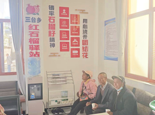 聚焦民生需求,打造便民服务“暖心站”。大姚县三台乡群众居住分散,每逢“街天”及学生收放假日,各族群众及流动商贩等汇聚集镇,面临休息不便、应急求助等问题。乡党委、政府充分利用便民服务大厅人流量集中、服务功能完善的优势,坚持“便民、利民、暖心、聚力”原则,在大厅一角开辟专区,建设石榴红·同心驿站。驿站内配齐饮水机、充电插座、休息座椅、应急药品箱、雨鞋雨衣等设施,解决居民日常小事难题、临时需求,让驿站成为各族群众“冷可取暖、热可纳凉、渴可喝水、累可歇脚、急可求助”的温馨港湾,为民族团结进步工作筑牢硬件基础。