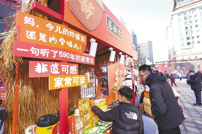 ▲2月12日,在北京市东城区2026隆福寺新春市集,市民带着孩子在六必居摊位前选购商品。新华社记者 鞠焕宗 摄