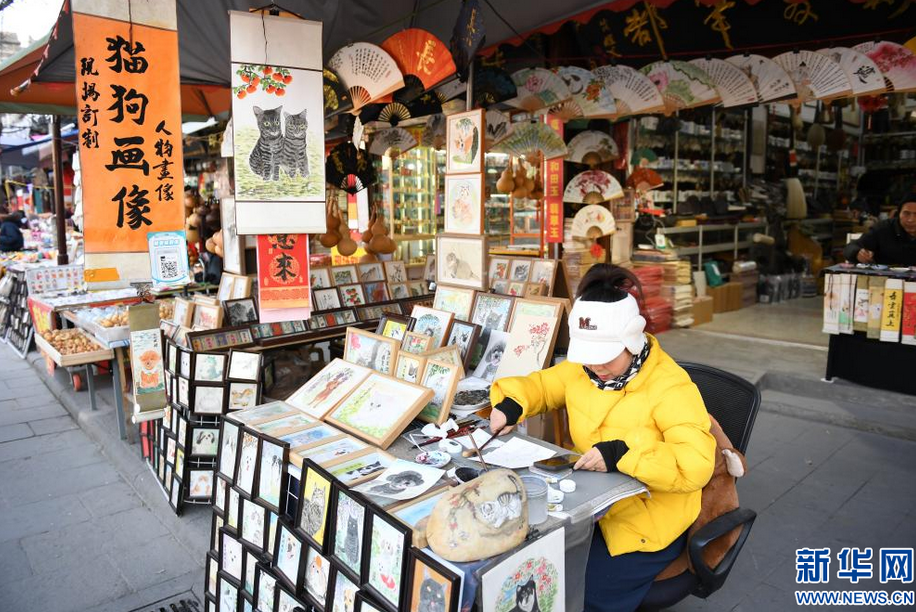 ▲1月9日,画师在西安书院门历史文化街区绘制宠物画像。新华社记者 李一博 摄