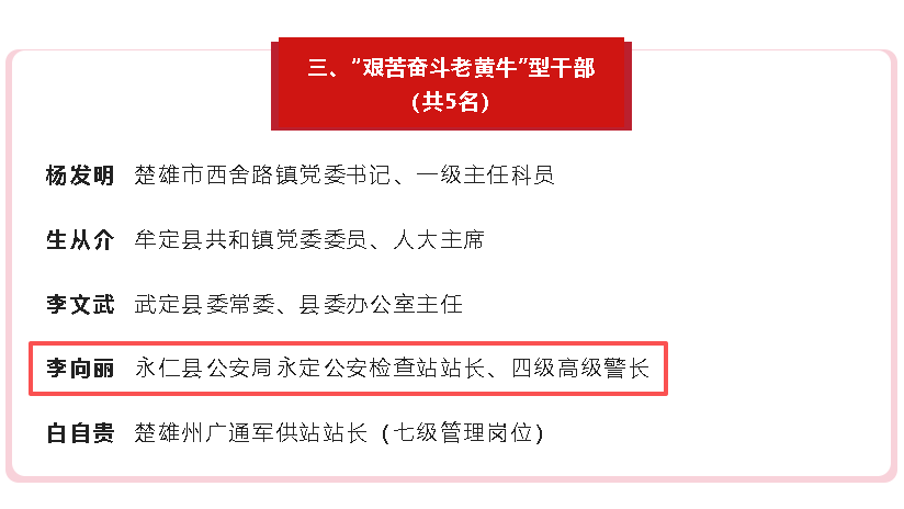 根据中共楚雄州委组织部关于选树“为民服务孺子牛、创新发展拓荒牛、艰苦奋斗老黄牛”型干部的统一部署,经广泛推荐、深入考察和严格评选, 永仁县公安局永定公安检查站站长、四级高级警长李向丽同志被确定为“艰苦奋斗老黄牛”型干部拟表扬人选。