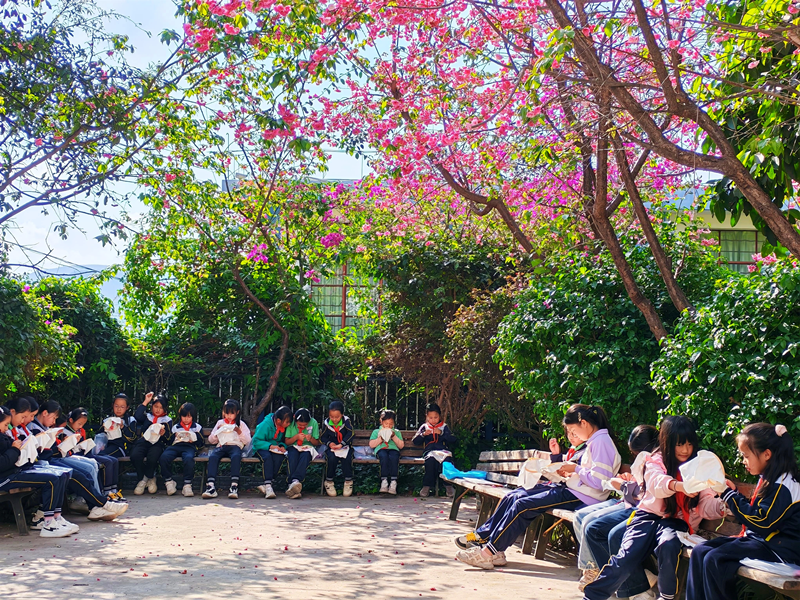 一校一品,“无作业”绝非空白日。“首个无作业日”,南华县红土坡中心学校作为山区寄宿学校推出了“非遗时光”“阅读时光”和“体育时光”,孩子们在开满樱花的校园角落里,刺绣、读书和运动。正在读六年级的李春艳说:“我特别喜欢彝绣,上了六年级后,学习压力大,父母已经很久不让我绣了,现在每周有一个晚上可以刺绣,特别开心,为了这个晚上,学习特别有动力。”而在县城的北城小学、龙川小学启航校区,学校推出运动、家务、亲子阅读等五大成长清单,“轻装回家、不背书包”成为孩子们周三放学的新姿态。