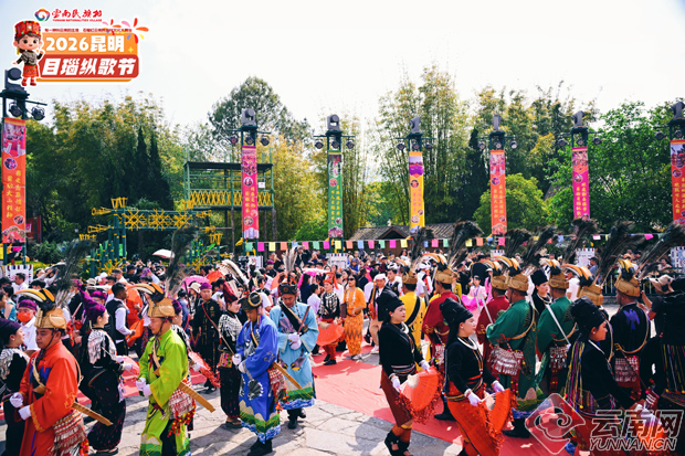 鼓声震天,银泡闪烁,舞步欢快。3月28日,以“传承目瑙纵歌·铸牢中华同心”为主题的2026年昆明景颇族目瑙纵歌节在云南民族村景颇寨开幕,来自四面八方的各族同胞与游客齐聚于此,共同参与了这场国家级非物质文化遗产的年度盛典,在歌舞欢腾中感受“有一种叫云南的生活”所蕴含的同心同乐。